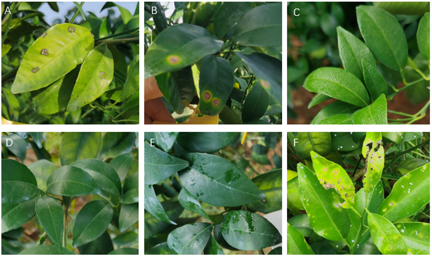 同時,針對柑橘潰瘍病田間試驗結果表明,兩次施藥后21天,對照藥劑2%春雷霉素稀釋500倍液平均防效為50.82%。2%春雷霉素稀釋600倍液+5%大蒜素稀釋1000倍液平均防效為76.80%。2%春雷霉素稀釋800倍液+5%大蒜素稀釋800倍液平均防效為81.96%。2%春雷霉素稀釋1000倍液+5%大蒜素稀釋600倍液平均防效為78.44%,減量增效效果顯著,2%春雷霉素減量超過30%,對病害防治效果提升20%以上。